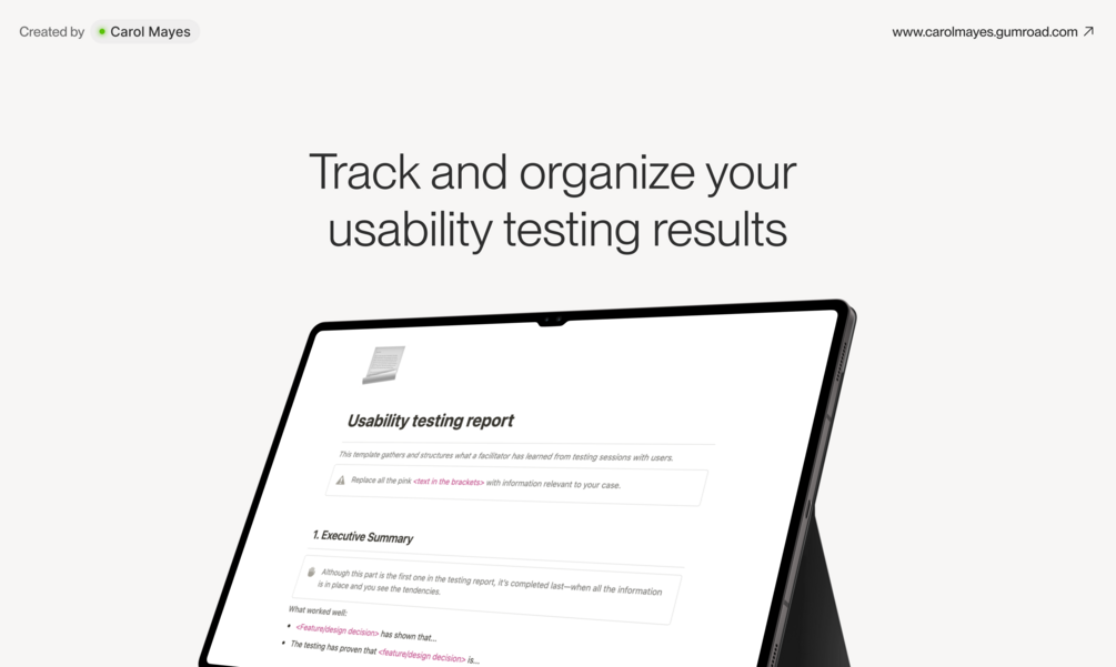 The Usability Testing Report offers a comprehensive structure to document and store the results of usability testing. This template organizes the insights gained by a facilitator during testing sessions with users. By using this template, product designers, project managers, product owners, and other team members can conveniently gather and analyze data, collaborate, and communicate their findings to stakeholders. As a result, the Usability Testing Report template is a valuable time-saving tool that can help streamline designers' workflows and increase their productivity.